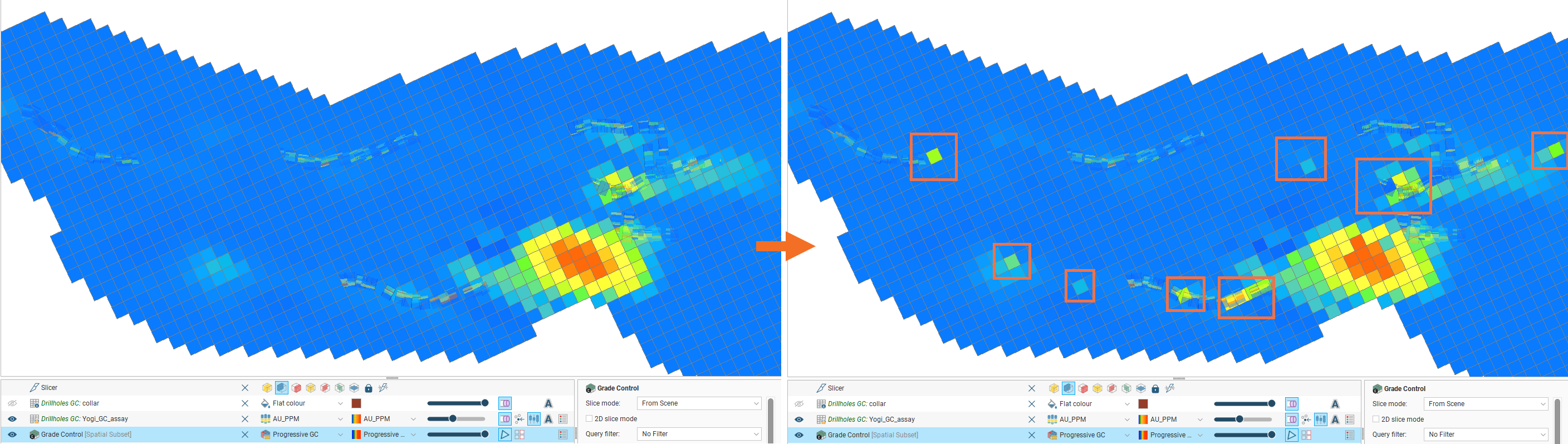 These images show slices through a block model before and after the block model’s evaluations were updated with grade control data, with some of the notable differences highlighted: