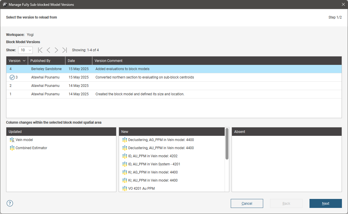To update to the new version, right-click on the block model and select Reload from Seequent Evo. A window showing the available versions will appear and you can choose the version you wish to work with. In this example, the currently loaded version is version 3. Selecting version 4 displays the column changes between the version currently in the project and the selected version: