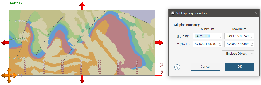 - Select Enclose Object and choose from the list of objects in the project. The clipping boundary will be updated using the selected object.