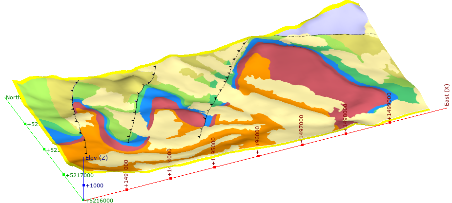 For example, here, a geological model’s extents could be defined using the lithology segments used as the base lithology: