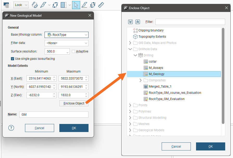 - The second option is to define extents based on other objects in the project. This is done by selecting the other object from the Enclose Object list that appears in many Leapfrog Energy screens.