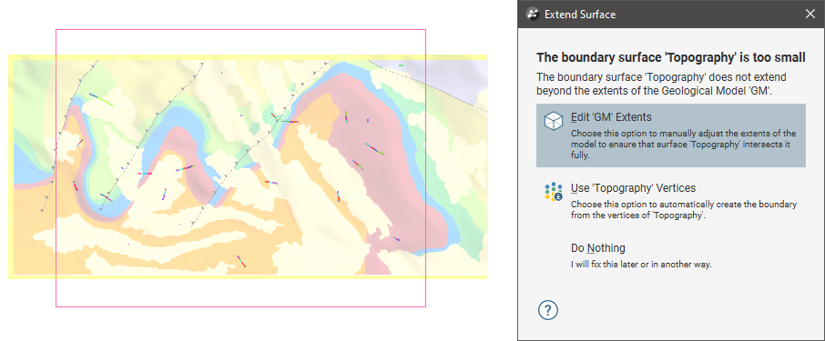 In this example, an error has occurred during the process of creating a geological model because the model extents (pink) do not fall completely inside of the topography: