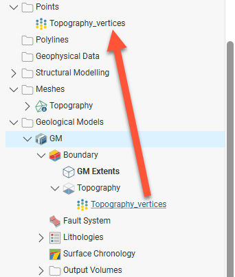 Using vertices to create the boundary or contact results in the creation of a new points object that will be saved in the Points folder. For example, here the geological model uses vertices to create the “Topography” used as an extent: