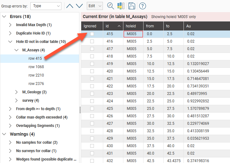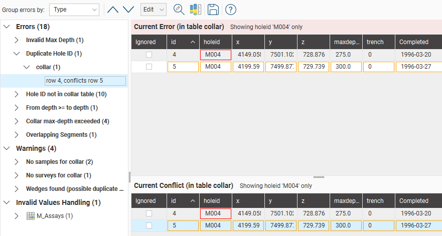 Collar tables will have Duplicate Hole ID errors when collars have been assigned the same ID. Here, rows 4 and 5 have the same ID but are clearly different holes: