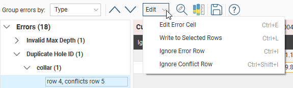 If you require a record of the errors in data, export the errors as described in Exporting Data Errors above before starting to correct the errors in Leapfrog Energy.