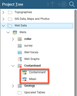 Leapfrog Energy automatically identifies and flags common data errors when data tables are imported. In the project tree, there are three ways Leapfrog Energy marks tables that contain conflicts or errors:
