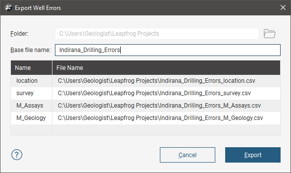If you need a record of corrected errors, first export the errors. This must be done first, as once errors have been corrected in Leapfrog Energy, they cannot be exported, as they no longer exist.
