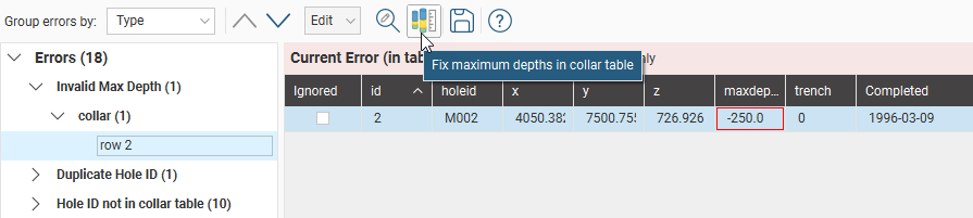 Interval tables will have Collar max-depth exceeded errors when the depth values in the interval table exceeds the maxdepth value defined in the collar table. The maxdepth defined in the collar table is often a theoretical value established before drilling. If the depth value flagged as an error is not unrealistic, click on the Fix Max Depths button (