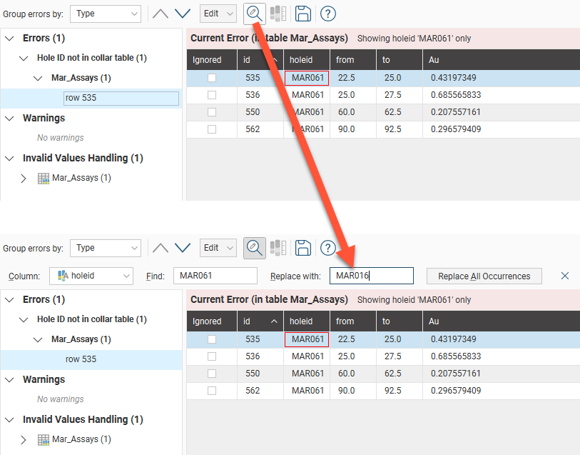 - The interval table uses the wrong hole ID. Use the Replace All tool to the incorrect values with the correct one. See Replacing Values in a Column above.