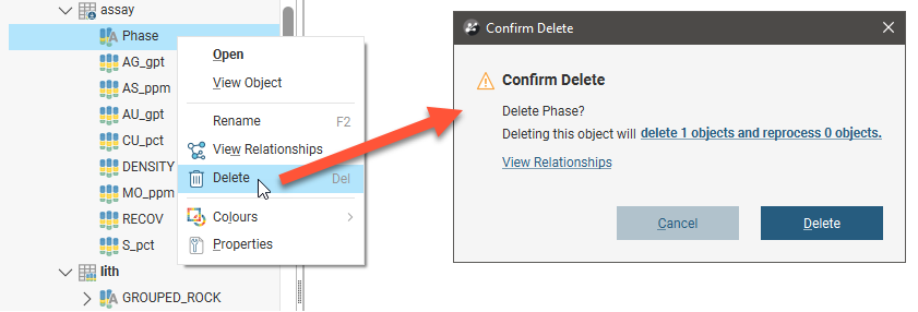 For column types that are displayed in the project tree, you can delete them by right-clicking on them in the project tree and selecting Delete. You will be asked to confirm your choice, as any objects in that project that have been created from that data column will also be deleted.