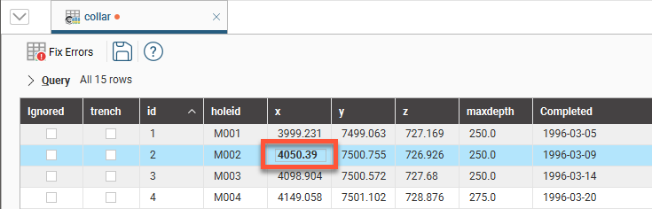 If a row in a collar table is ignored, then all other data associated with that hole (e.g. surveys and interval measurements in other tables) are also ignored.