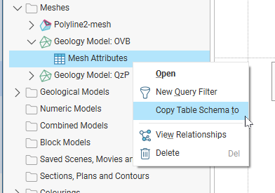 For mesh and polyline attribute tables, the data columns are not shown in the project tree. To view the attribute columns, right-click on the table in the project tree and select Attribute Table.