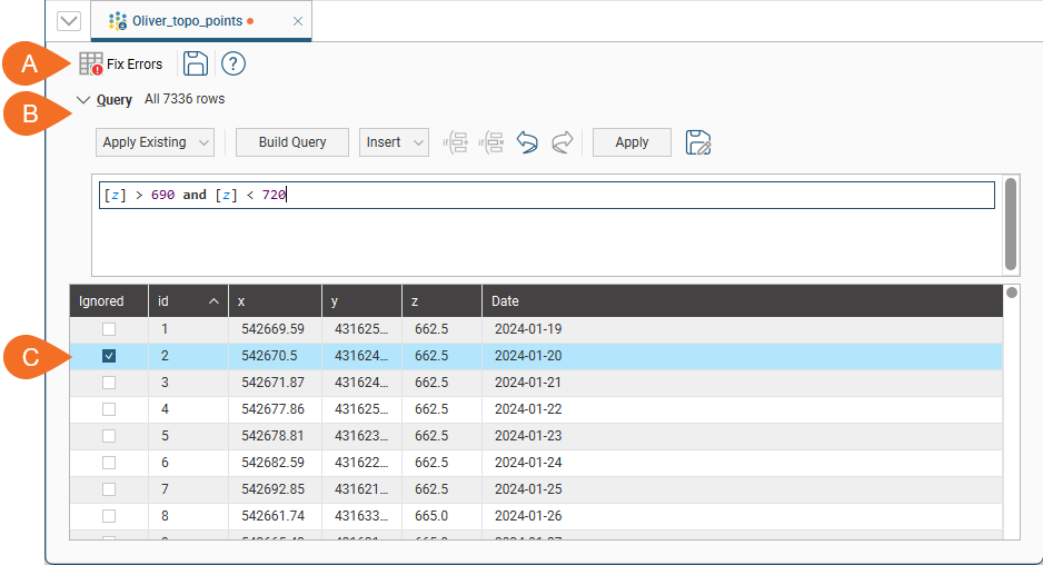 - Selecting rows and setting them to be ignored (C). If the Ignored column is ticked, then Leapfrog Energy completely ignores that row, as though it has been deleted. This is useful for suppressing erroneous data from being processed.