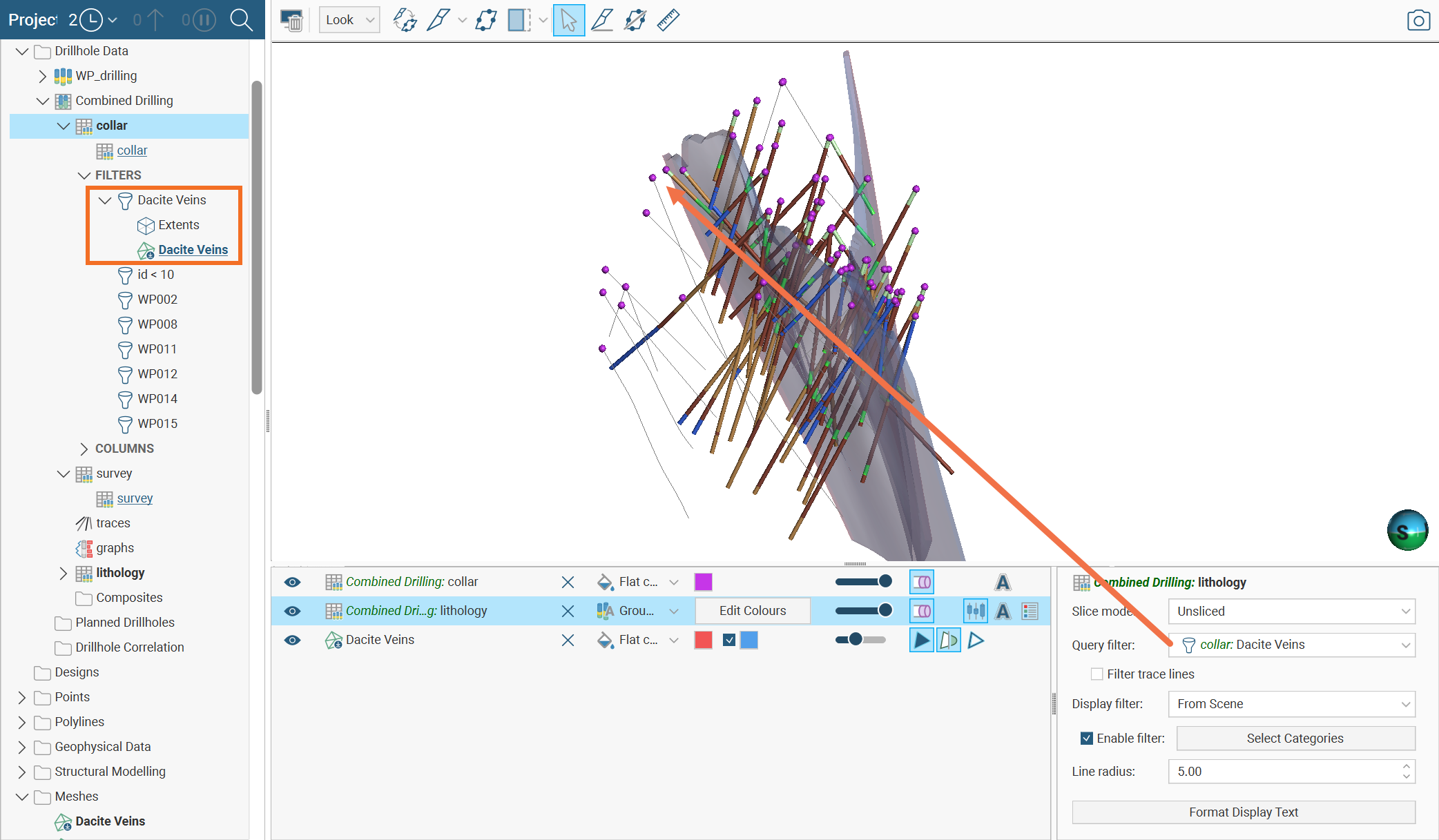 For a drilling data table, this displays only the data selected by the filter. The trace lines remain displayed in the scene. To filter out the trace lines so they are not displayed in the scene, tick the Filter trace lines box: