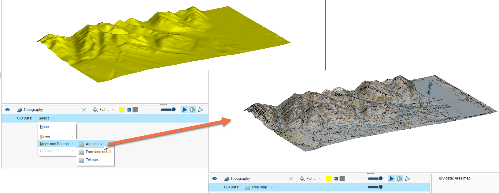 Next, add the topography to the scene and in the shape list, click on the topography’s GIS Data list. Select the image you wish to view from the Maps and Photos submenu: