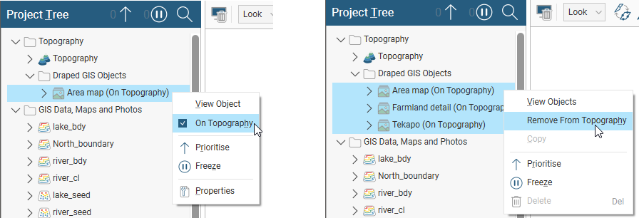 To remove an object from the topography, right-click on either it or its draped copy in the Draped GIS Objects folder and untick the On Topography box. For multiple objects, select Remove From Topography.