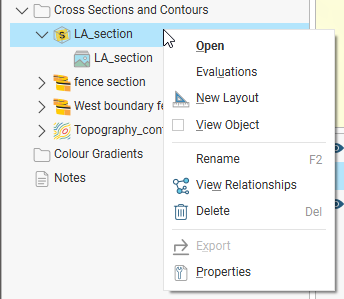 You can evaluate geological models, interpolants, distance functions and surfaces on the section and create section layouts. See Evaluations. and Section Layouts for more information on these options.