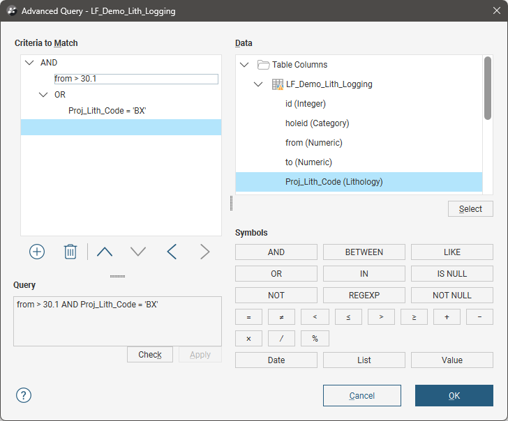 Numeric values you enter into the query do not need to be enclosed in quotes, but text being used as a query token needs to be wrapped in single quotes. In this example, a test that the lith code column matches BX has been included, so ‘BX’ is used in the query. Because the top level branch node is an AND, the whole query is checking for a from depth exceeding 30.1 AND a lith code of BX: