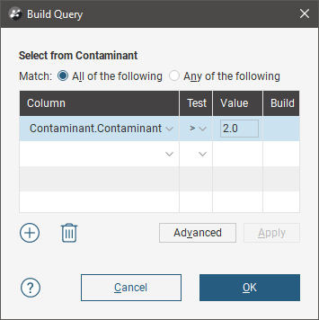 The second window, the Build Query window helps you build some common queries by selecting from the data columns in the table and defining different tests. Open this window by clicking the Build Query button in the New Query Filter window. See The Build Query Window for more information on building queries in this way.