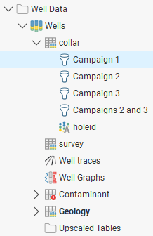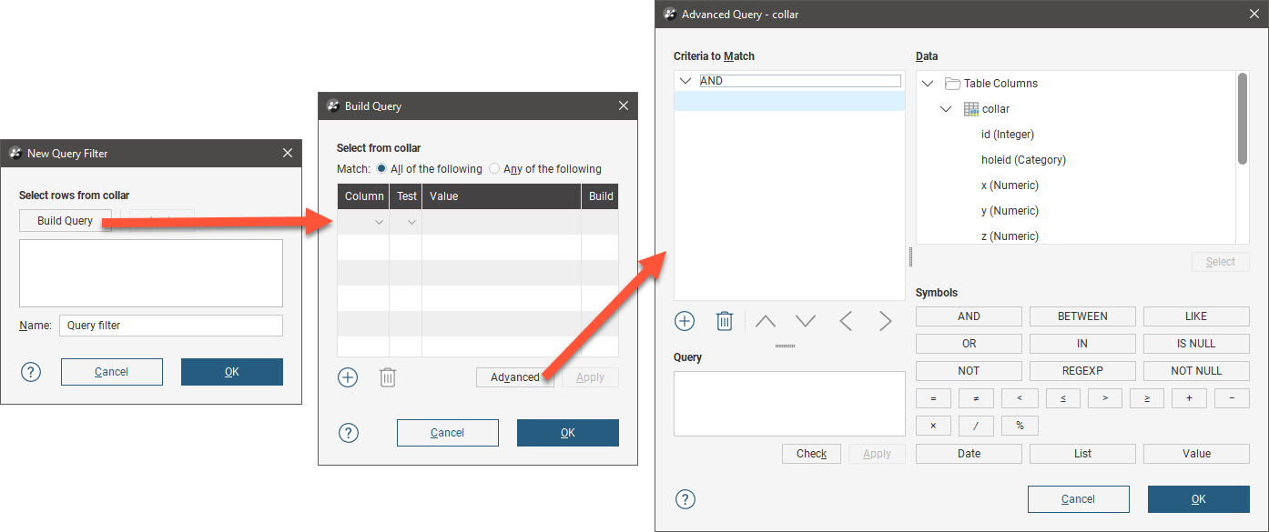 The standard query builder is used for creating queries for all data tables in Leapfrog Energy except for imported points data tables. For information on building queries for points data tables, see The Points Query Builder.