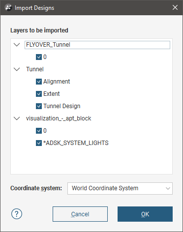 All models and layers available in the selected files will be displayed. Here three files have been selected for import, FLYOVER_Tunnel, Tunnel and visualization_-_apt_block: