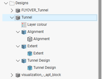 The model will be added to the project tree; expand it to see the different layers. For example, here a Tunnel file has been expanded in the project tree, showing the different layers: