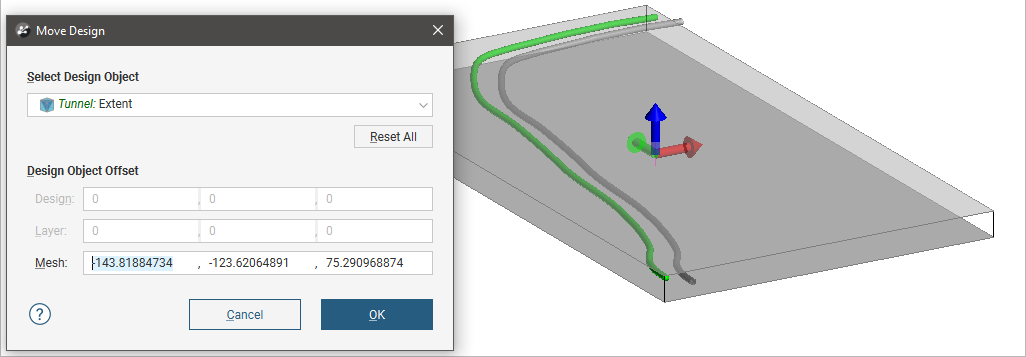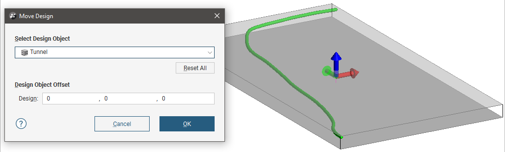 Click on one of the arrows in the scene to move the design; you can only move in one plane at a time. Updated values will be displayed in the Move Design window.