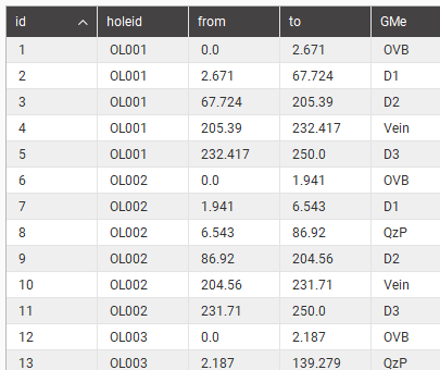 Click OK to create the new table, which will appear in the project tree as part of the drilling dataset. The new table contains From, To and Lithology columns defined using the intersection between the model’s output volumes and the wells.