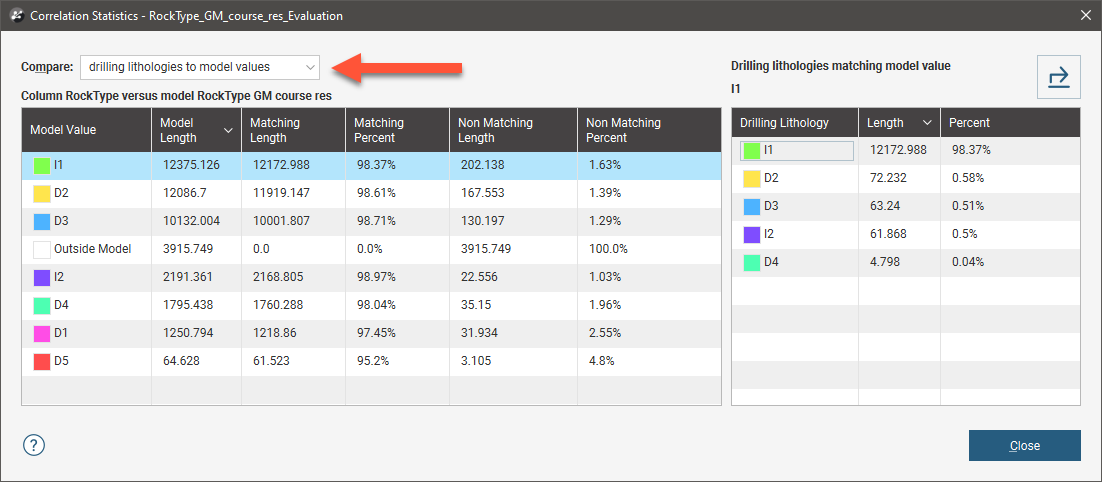 The non-matching percentage indicates how much of the modelled lithology is not the drilling lithology. You can see in the right-hand side of the window the lithologies that make up the non-matching portions of the modelled value.
