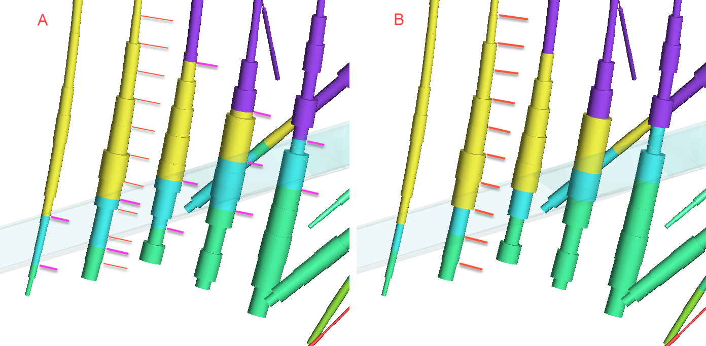 Note that this merged table will split assay intervals where the geological model showed a transition from one lithology to another, as shown above at lines 1 and 2 , and also lines 6 and 7, and so on. Below, in scene A, a modelled vein cutting across wells is illustrated. The drillhole diameter is indicating the assay value and the colour is indicating the lithology. Thin orange lines have been over-draw to show the original assay intervals, while the thicker pink lines show new intervals created by the merging of the tables. An alternative that utilises the existing interval midpoints when allocating the geological modelling lithology as an additional column is illustrated in scene B. If this strategy is preferred, see Evaluated Column from Geological Model.