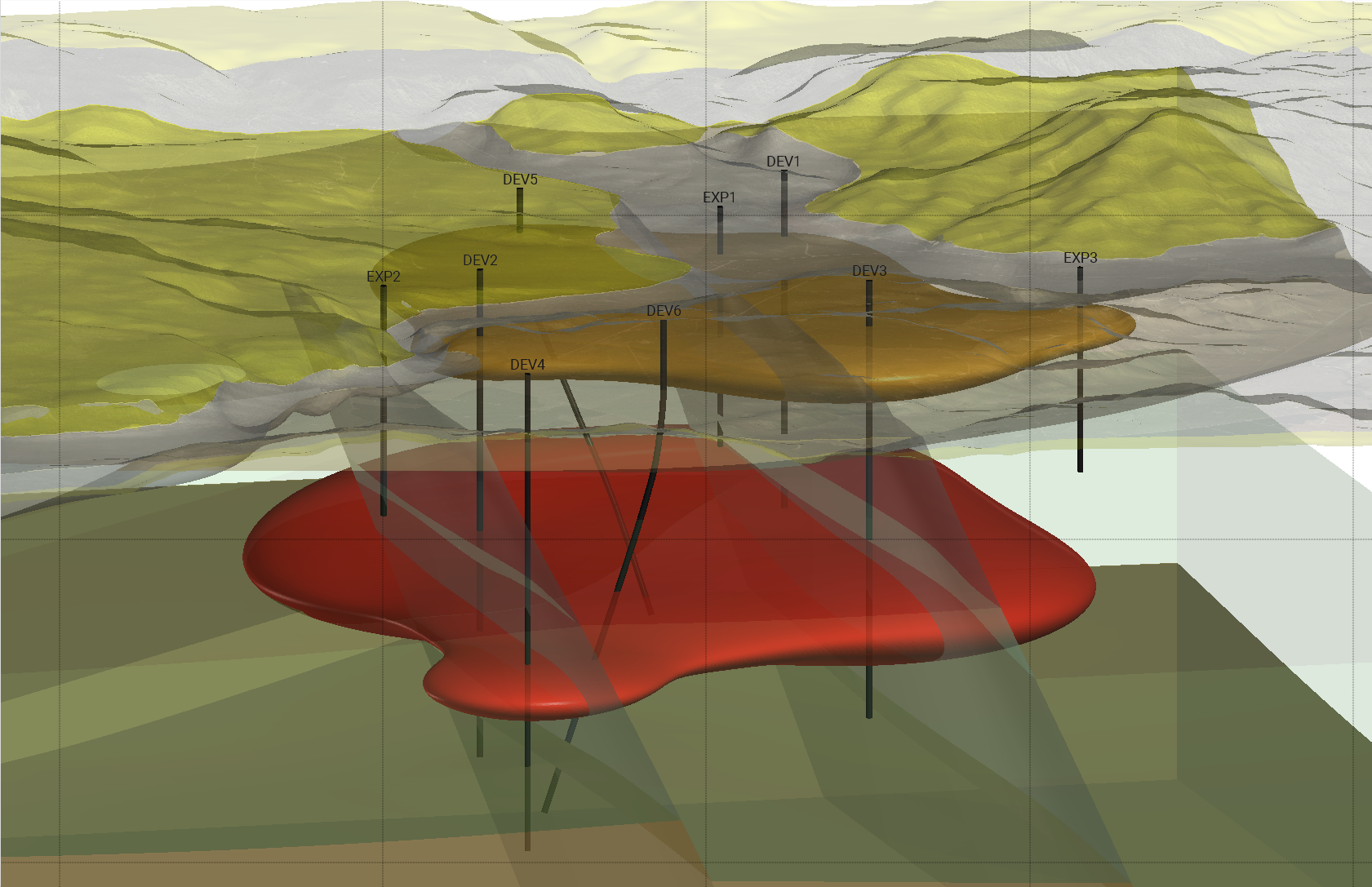 Directional wells are used to reach targets that might be otherwise impossible to reach with a vertical well or to reach a spread of targets from a single drilling area. In Leapfrog Energy, you can define a directional well by adding different sections to the well path, then changing their Section type and parameters. The example illustrated here is not realistic, but it does demonstrate the flexibility of the directional drilling tool: