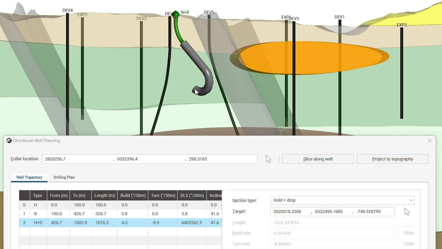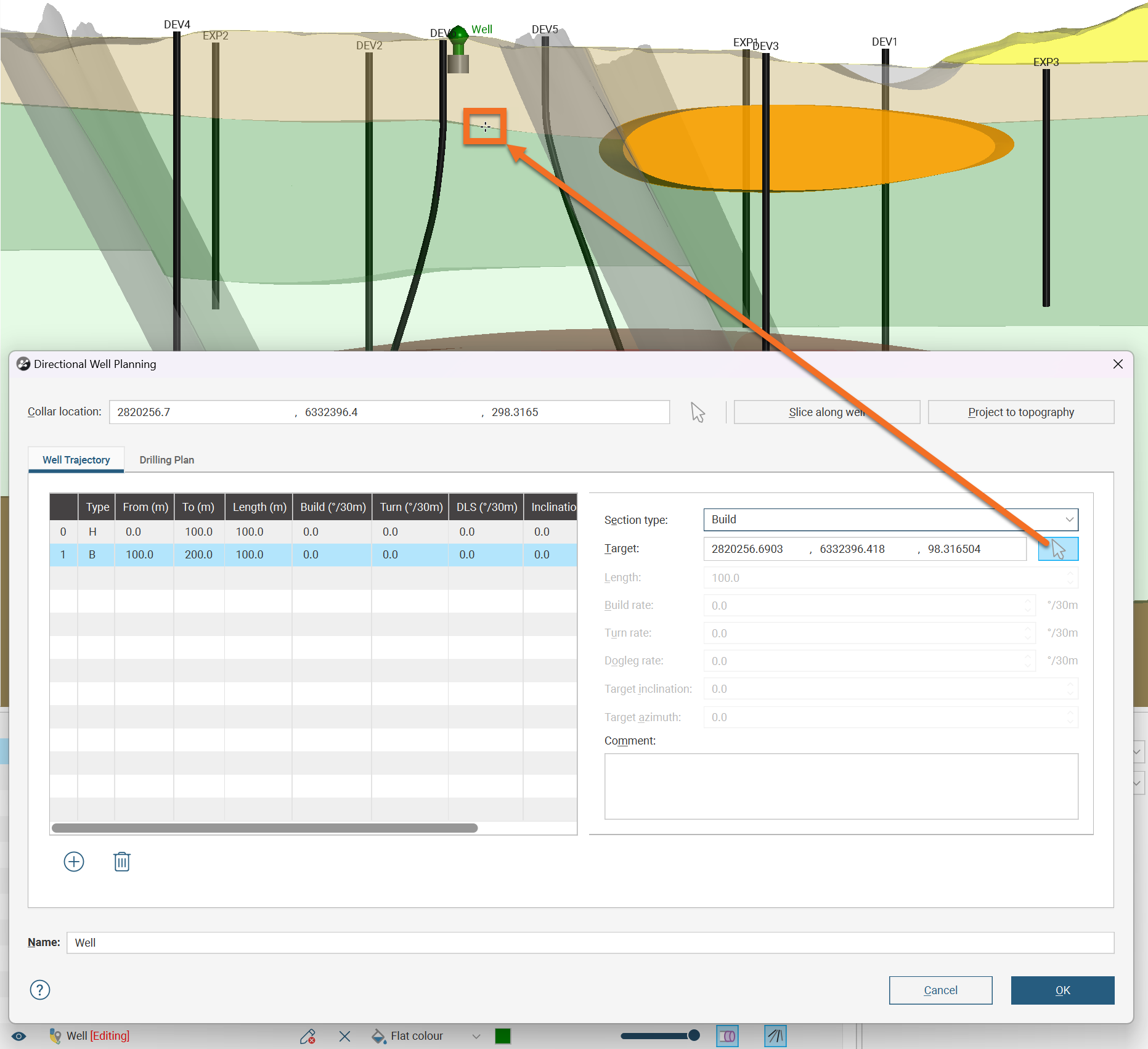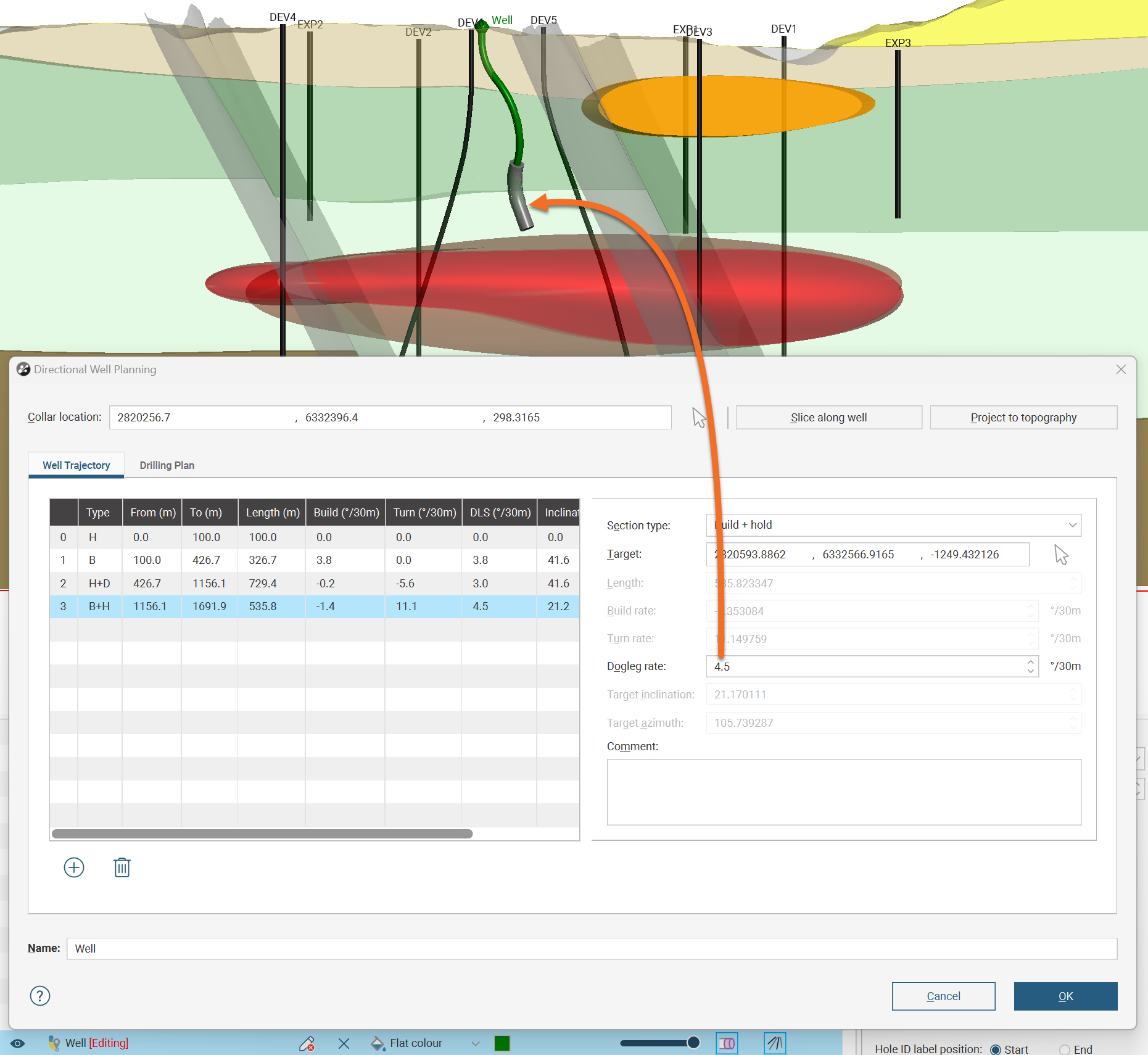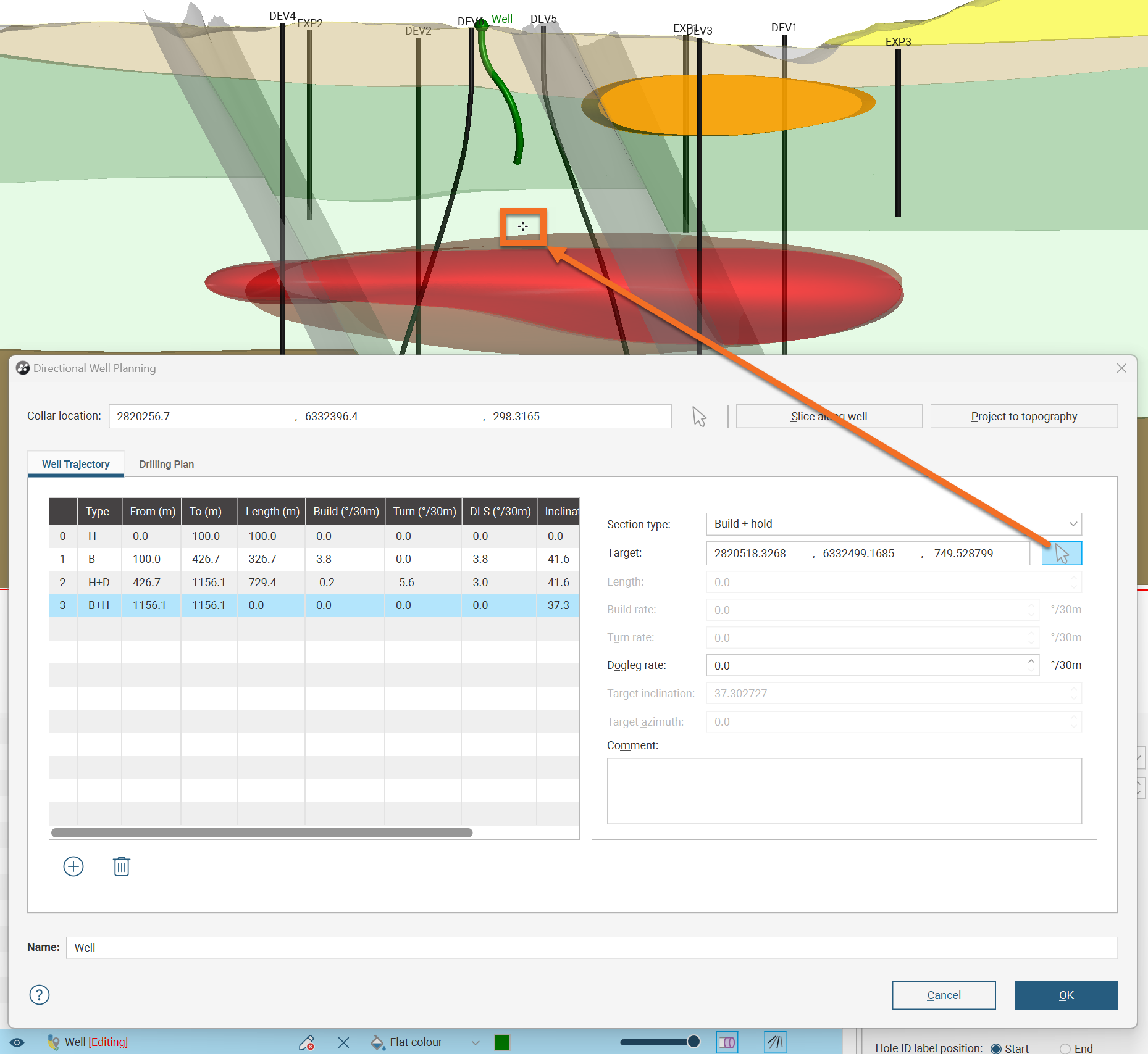 A Hold + drop section continues the planned well in the current inclination and azimuth for a certain distance, then begins to curve at a constant given rate. As for a Build section, you need to select a Target location, either using the X, Y and Z coordinates, or you can click the Target select button and click in the scene to set the target at a specific point on the slicer plane.