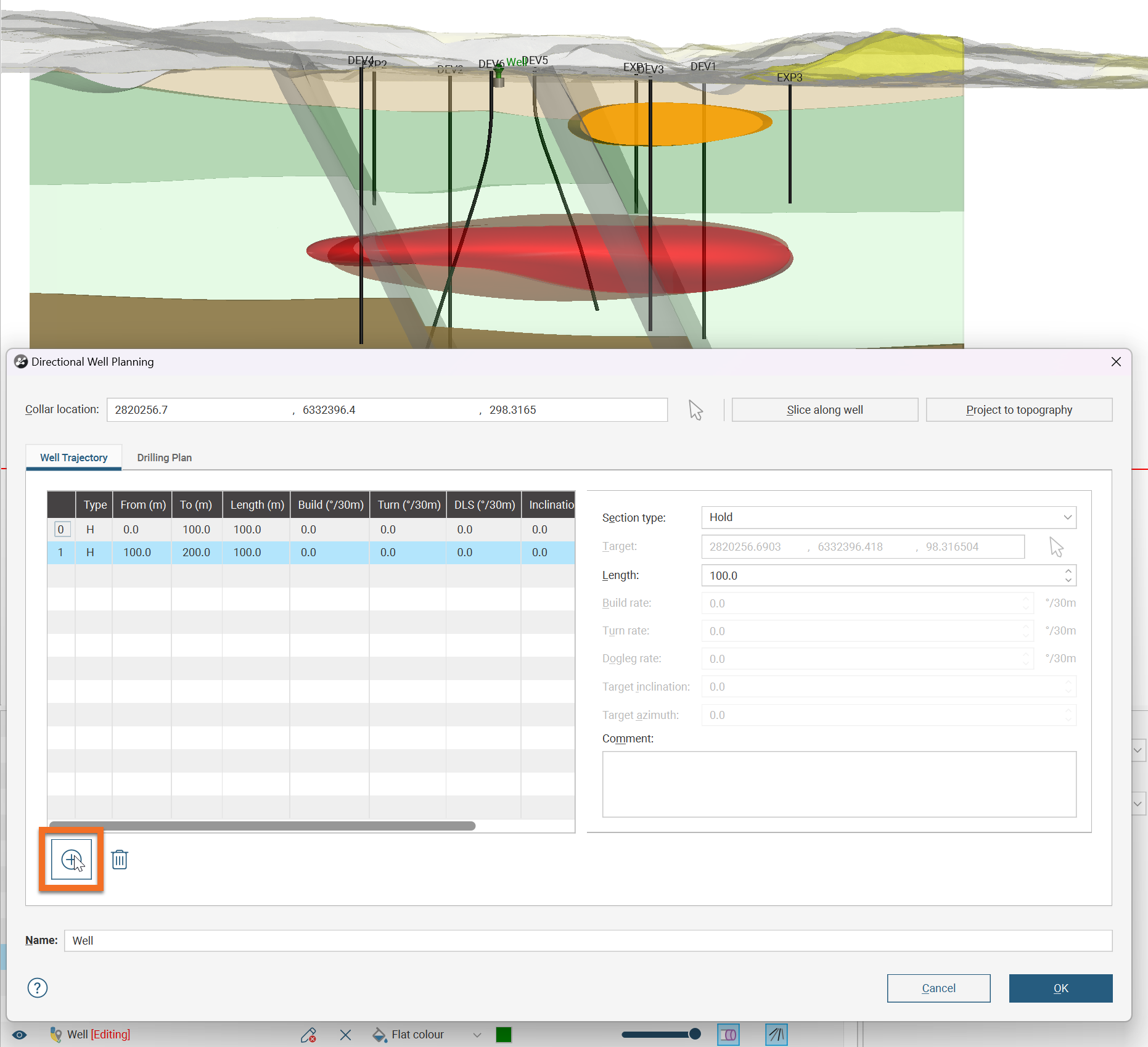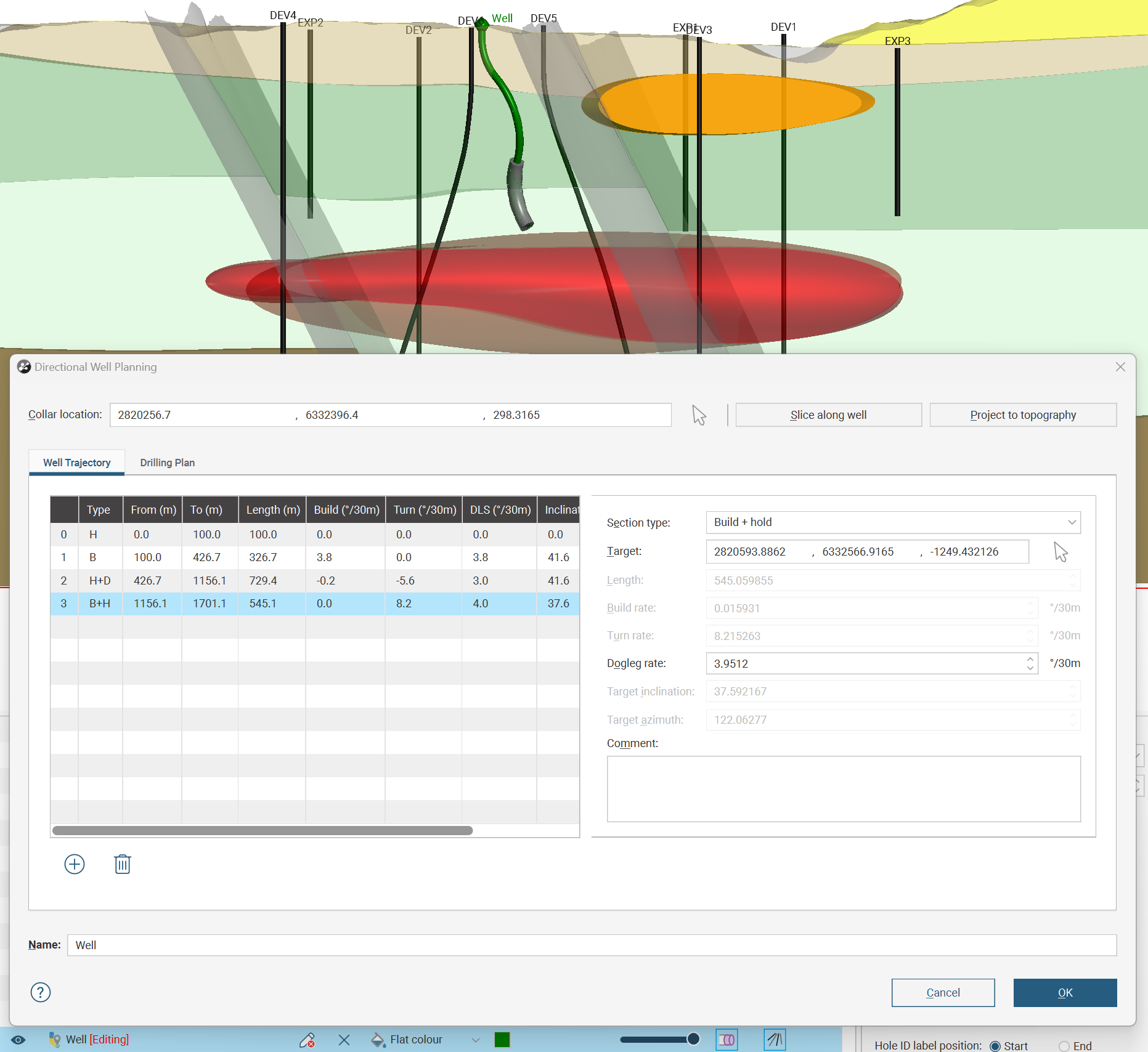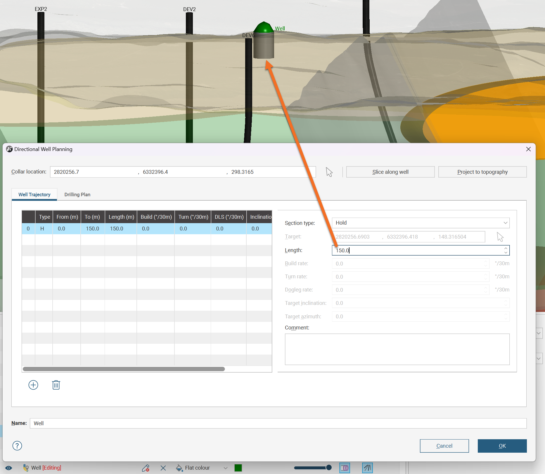 A Hold + drop section continues the planned well in the current inclination and azimuth for a certain distance, then begins to curve at a constant given rate. As for a Build section, you need to select a Target location, either using the X, Y and Z coordinates, or you can click the Target select button and click in the scene to set the target at a specific point on the slicer plane.