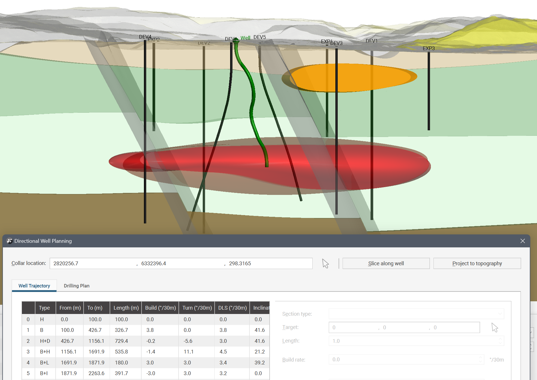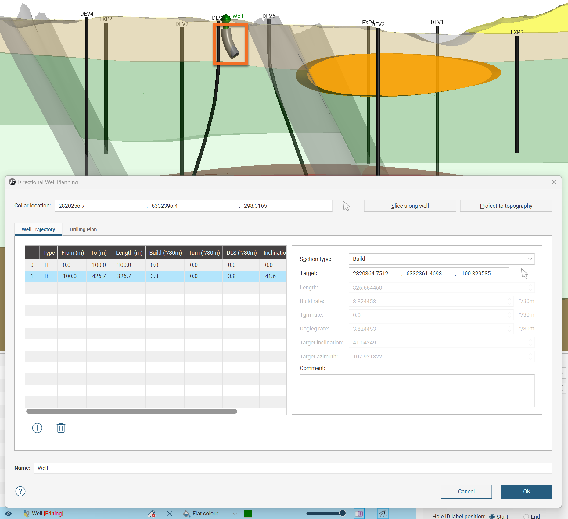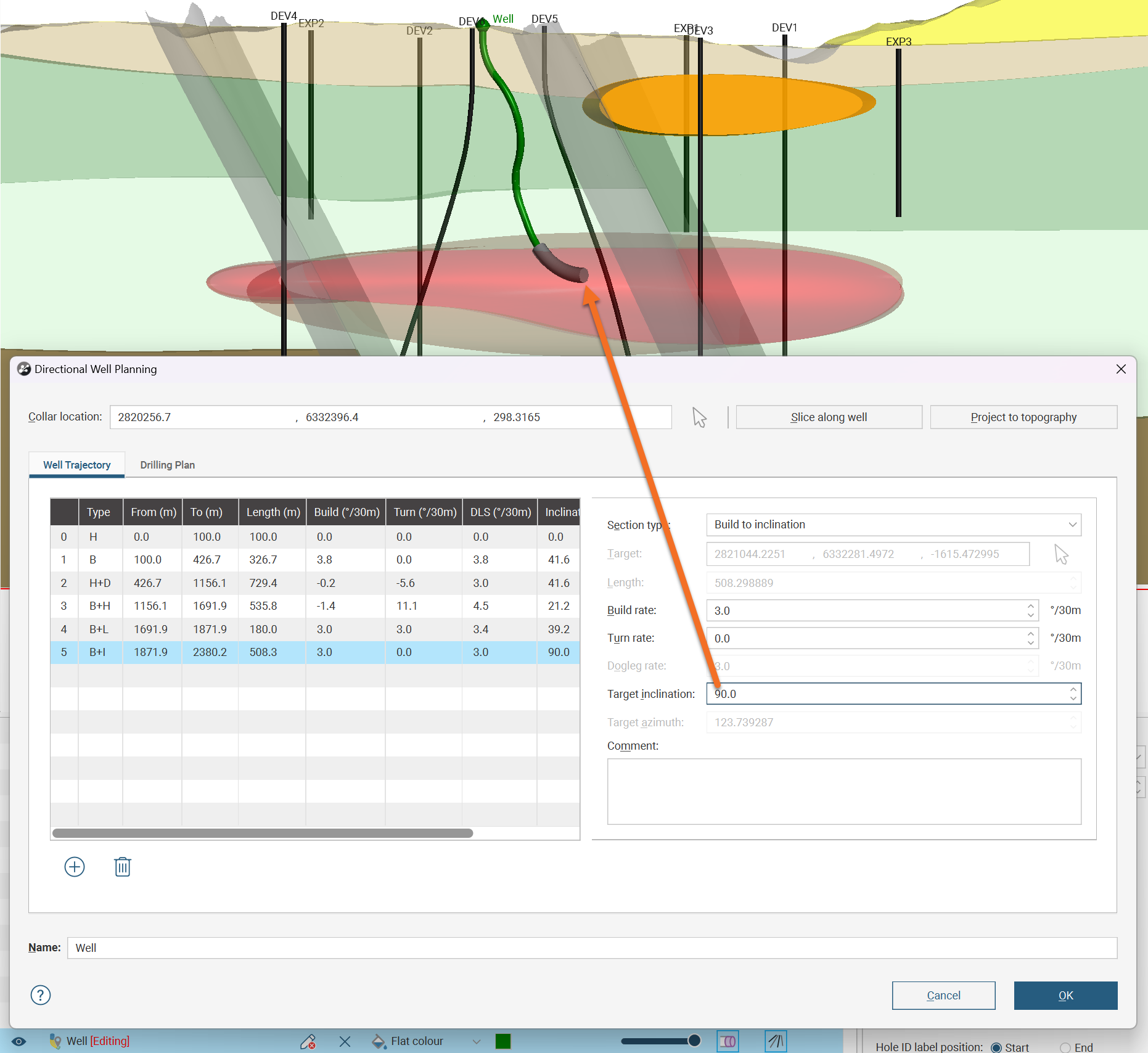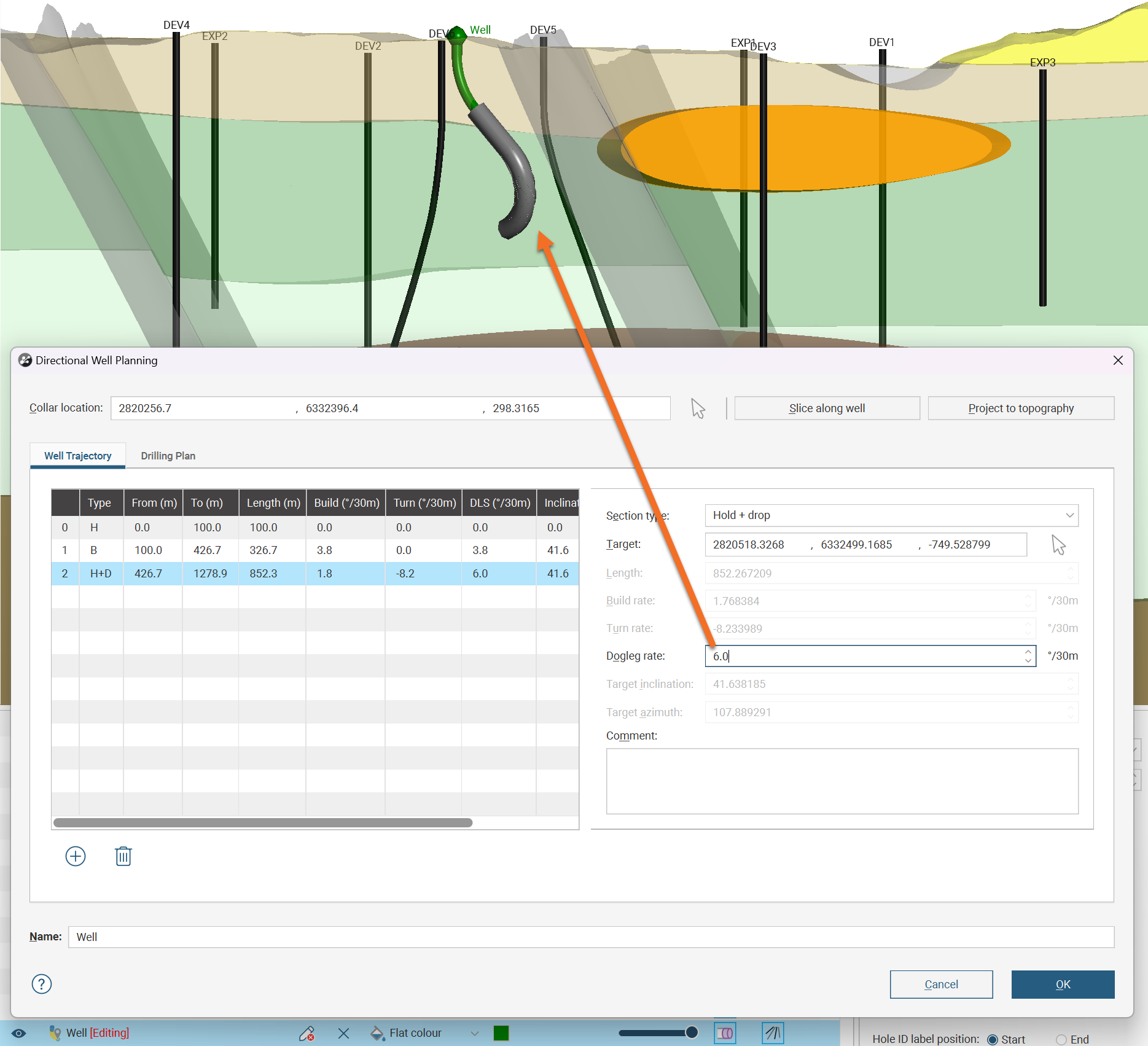 A Hold + drop section continues the planned well in the current inclination and azimuth for a certain distance, then begins to curve at a constant given rate. As for a Build section, you need to select a Target location, either using the X, Y and Z coordinates, or you can click the Target select button and click in the scene to set the target at a specific point on the slicer plane.