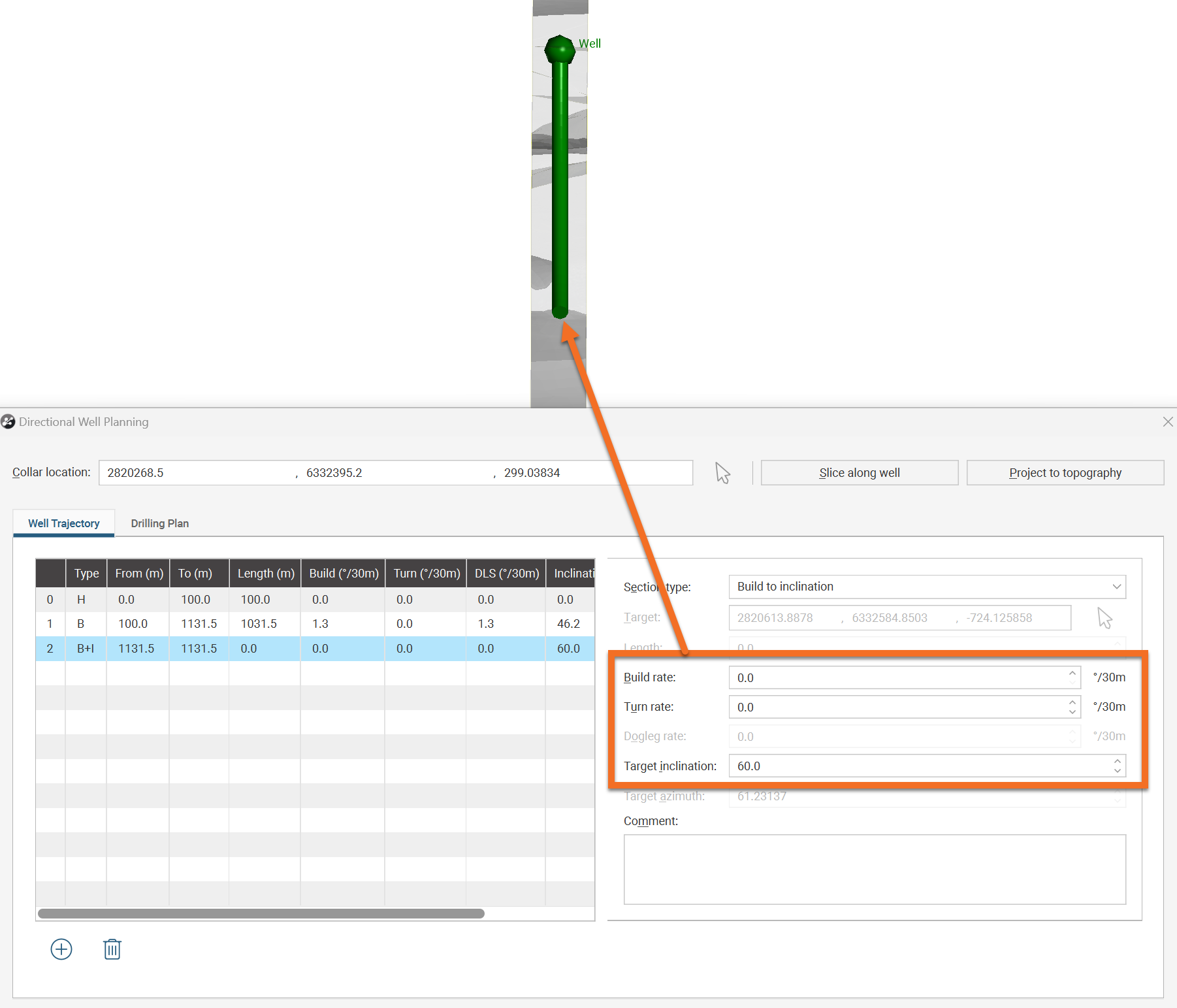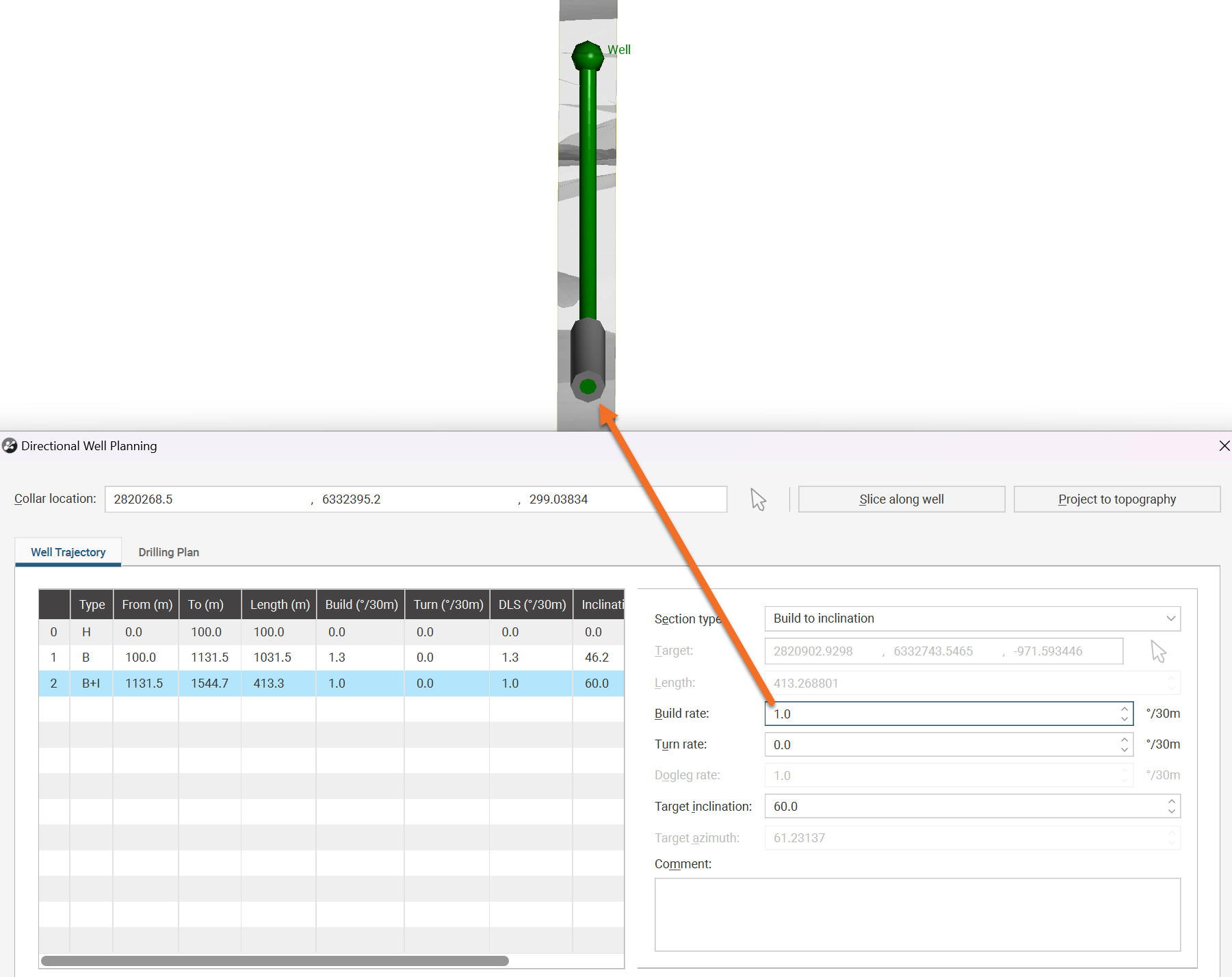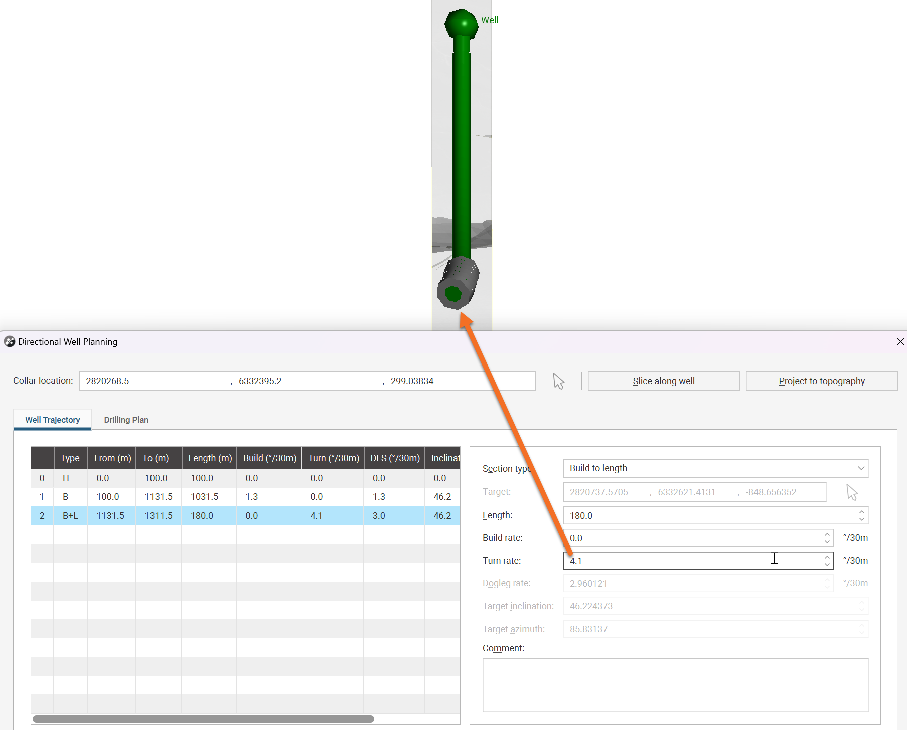 Specifying a Build rate will curve the well without changing the azimuth, although if it is combined with a Turn rate there will be a net change in azimuth direction. Note the combined Dogleg rate is calculated and shown so you can check you are not exceeding the maximum rate the drilling equipment supports.