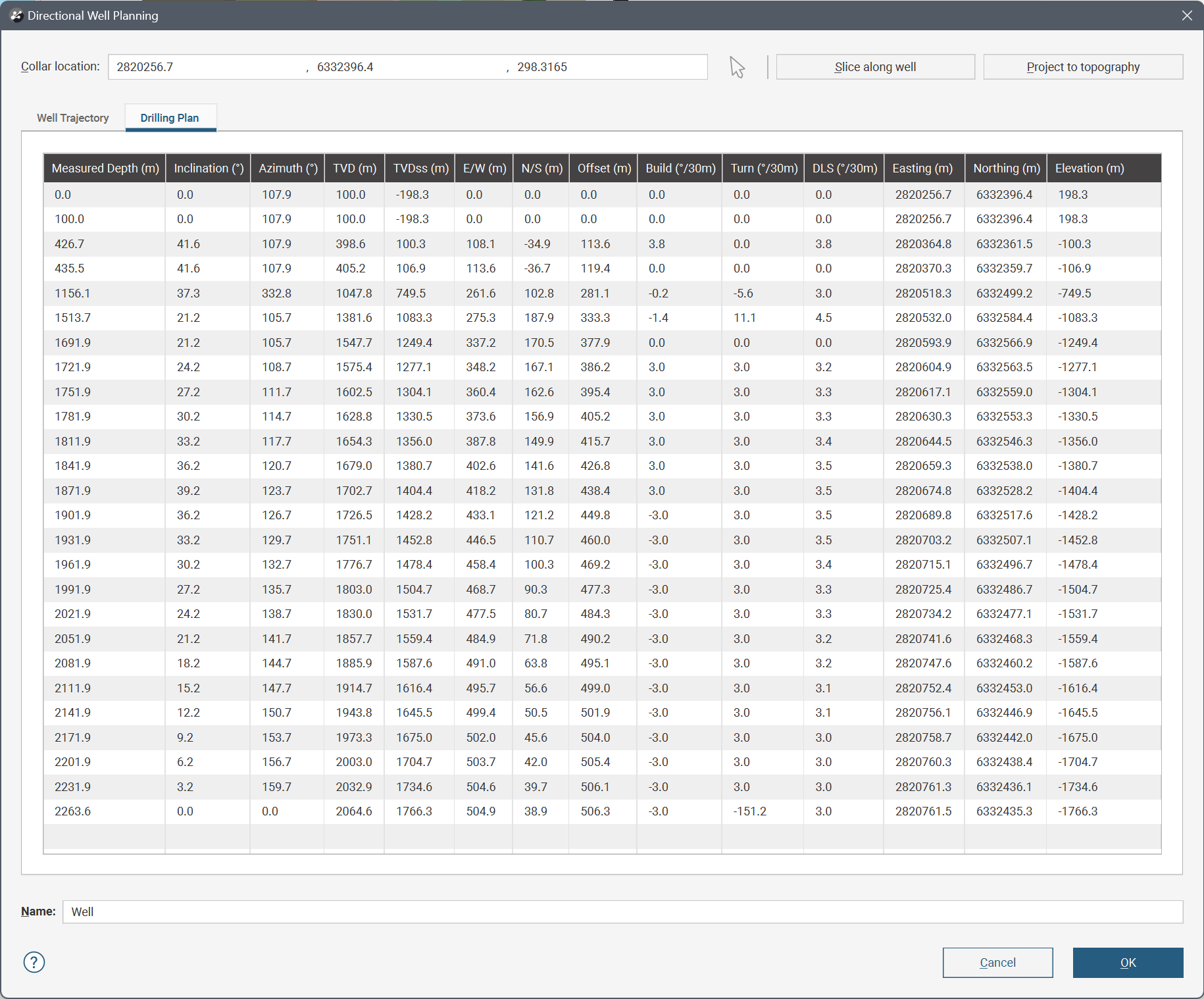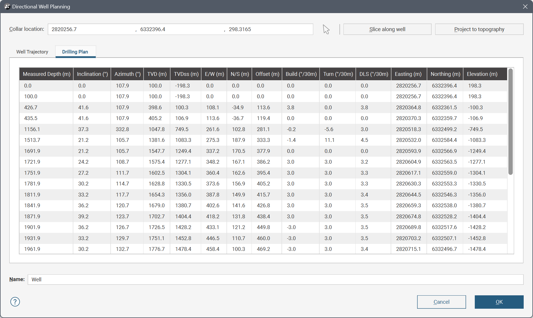 The final planned well can be exported as interval tables, as points or as a drilling plan. You can also import a drilling plan.