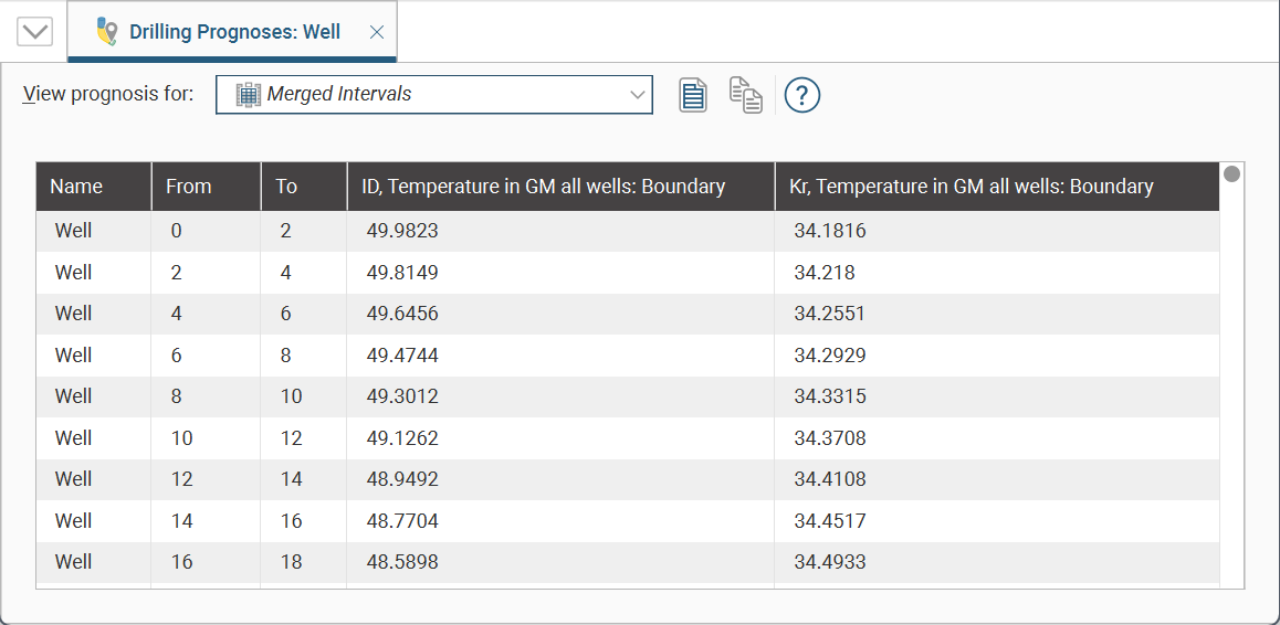 The dropdown list contains all evaluations on the well, along with a Merged Intervals option that combines the information from all evaluations. You can copy the information displayed to your computer’s clipboard by selecting rows, then clicking the Copy button (