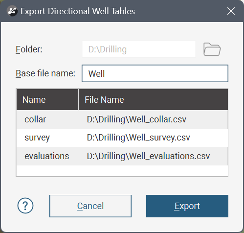 A planned well can be exported as interval tables in *.csv format. To do this, right-click on the well and select Export as Interval Tables. In the Export Directional Well Tables window, the files that will be created are listed, one each for the collar and survey table and one for the evaluations: