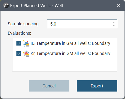 To export a planned well as points, right-click on the well and select Export as Points. In the window that appears, select where you wish to save the file, enter a file name and then click Save. Next you will be prompted to select which evaluations to include: