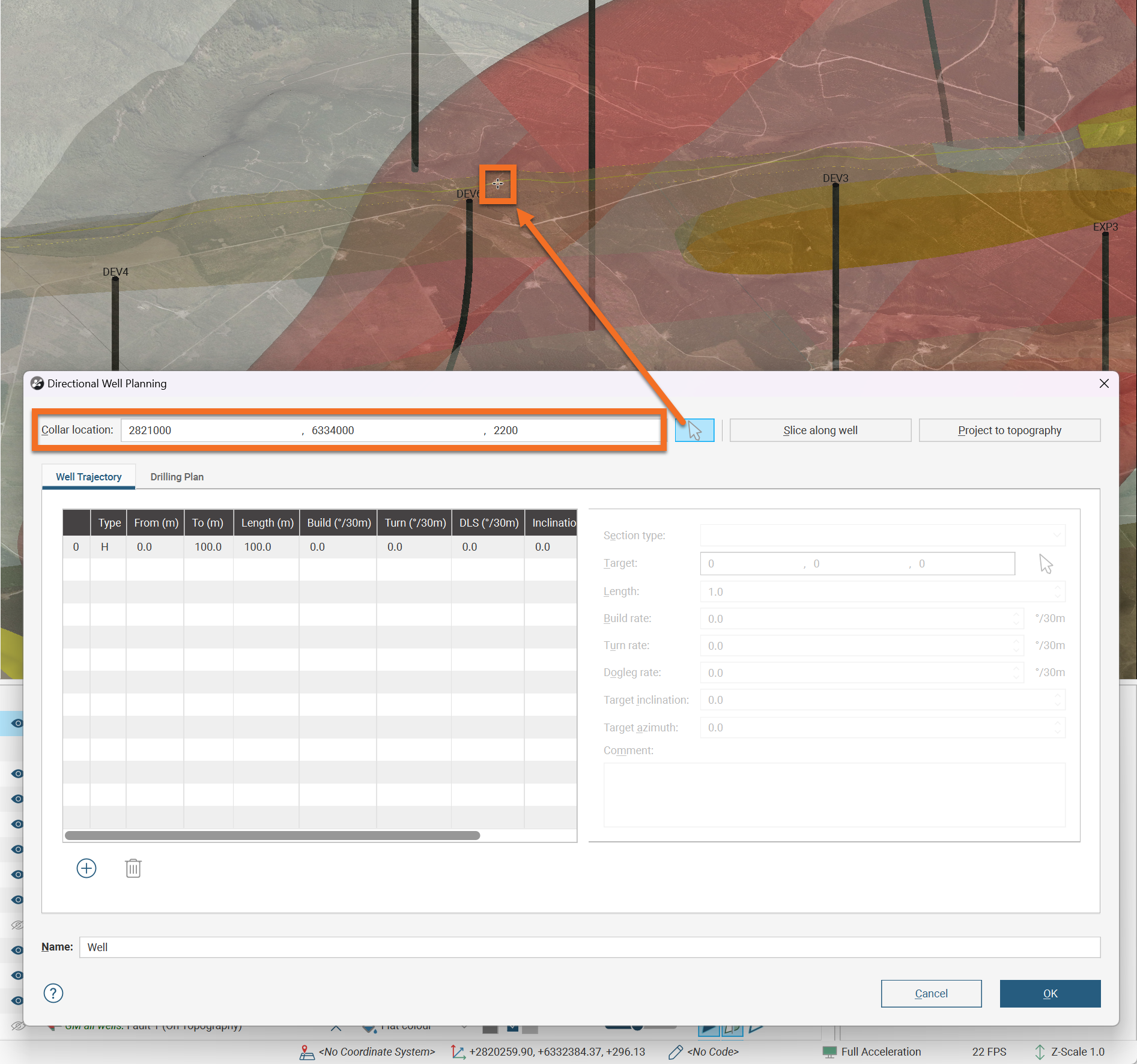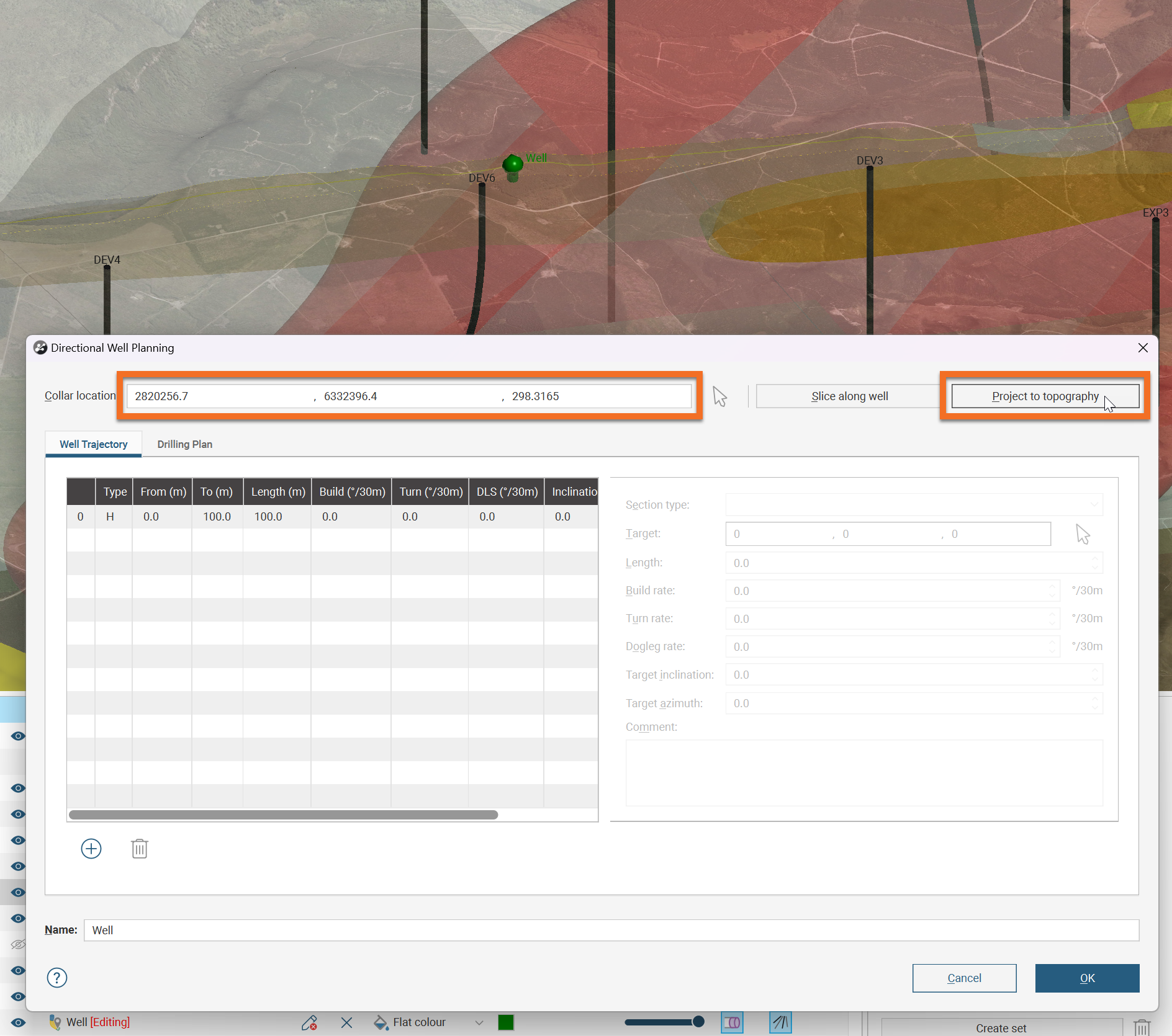 Click the Project to topography button to force the top of the well to sit on the topography. Notice that the Collar location values have been updated after this button was clicked: