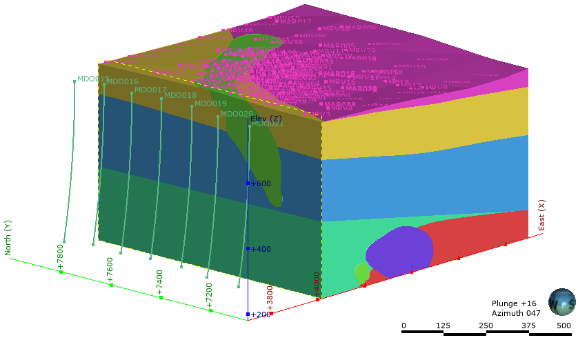 Planned drillholes can be evaluated against any model in the project. To view drilling prognoses for a drillhole, right-click on a drillhole group in the project tree and select Drilling Prognoses. The Drilling Prognoses tab will appear: