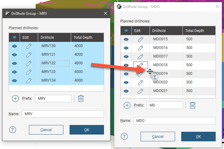 You can copy planned drillholes between groups by opening both groups, then dragging drillholes between the groups. For example, here the drillholes selected in the first group are being copied into the second group: