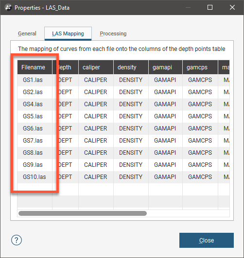 The Properties window for LAS Wells includes a LAS Mapping tab that shows what data files have been used for the selected well: