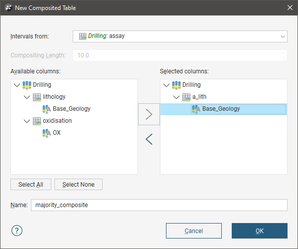 Drilling data is composited from the Composites folder, which is in the project tree as part of each drilling dataset. To create a majority composite, right-click on the Composites folder and select New Majority Composite. The New Composited Table window will appear. Select the interval table that will be used to specify the intervals for the new majority composite or specify a fixed Compositing Length. Next, select the columns that will be composited.
