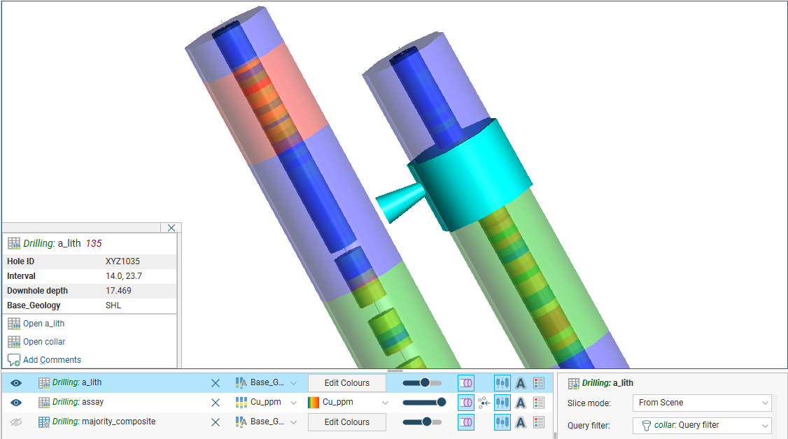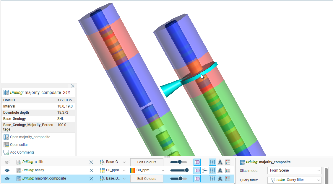 Here a majority composite has been created based on the lithology table using the assay table intervals. The category column displayed in the scene appears similar to the category column used to create it, but selecting an interval in the scene shows that the lithology has been composited into smaller intervals that match the assay intervals: