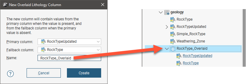 The New Overlaid Lithology Column window will appear. For the Primary column, select the column that you wish to have precedence. Data in the Fallback column will be used when no data is available from the Primary column. Here, the RockTypeUpdated columns will be used as the Primary column and intervals in that column that don’t have data will use the RockType column: