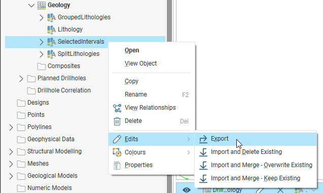 To export a list of interval selection edits, right-click on the interval selection in the project tree and select Edits > Export: