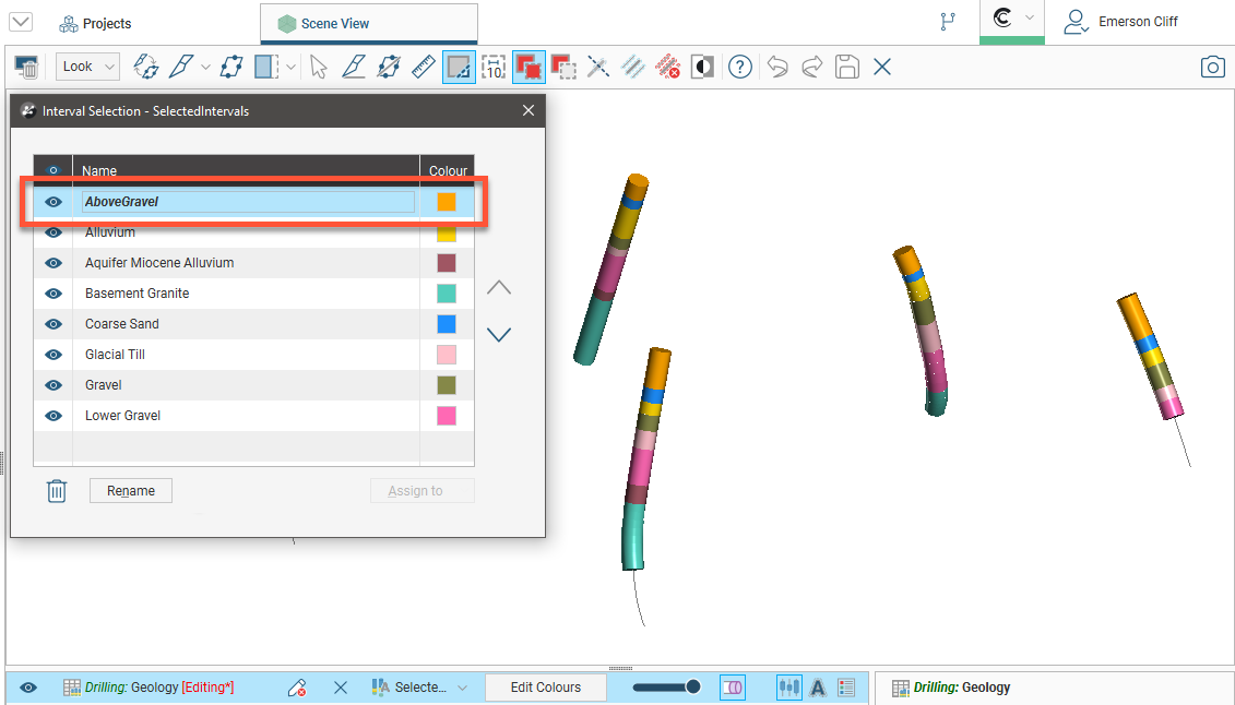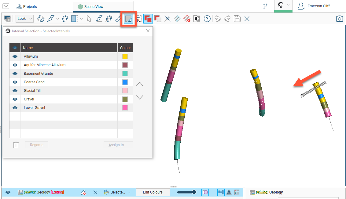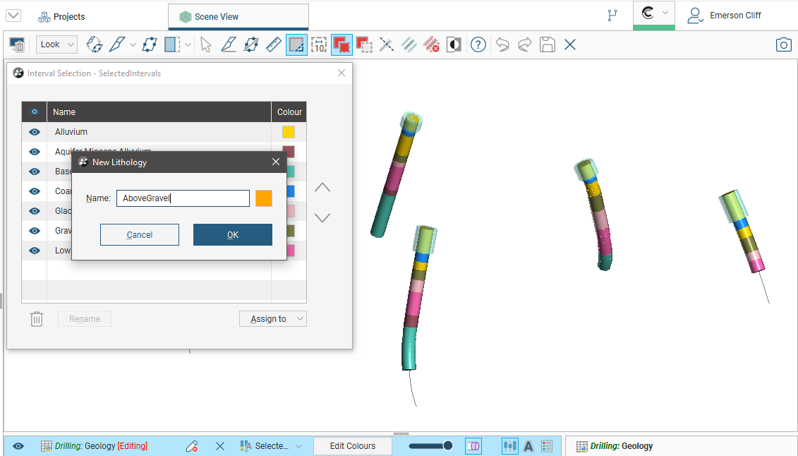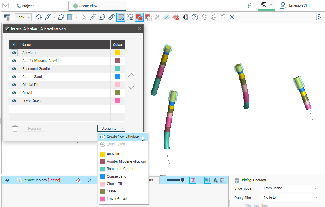 • Assign more intervals to the lithology. Select intervals in the scene, then select the lithology from the Assign to list.