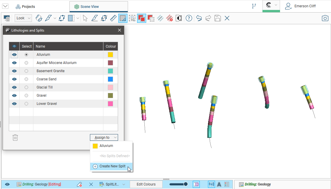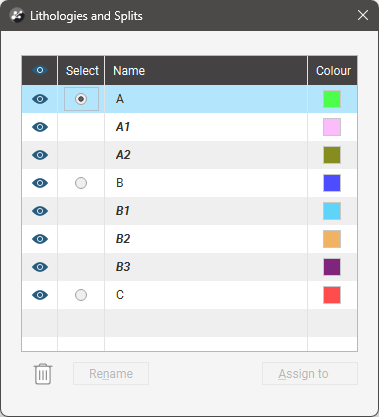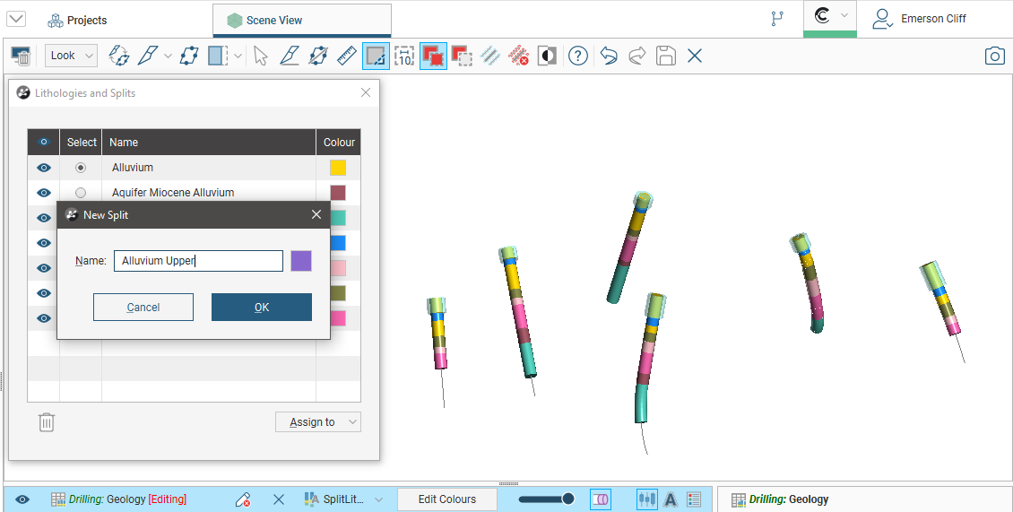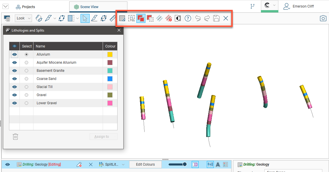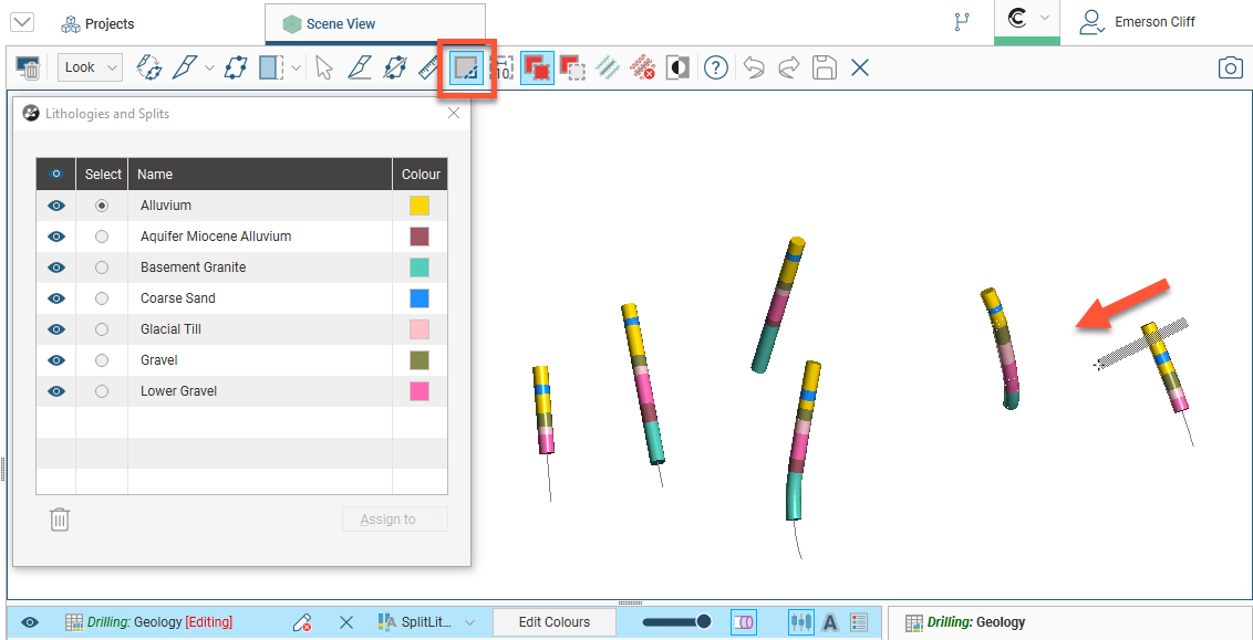 The Lithologies and Splits window will appear, together with a set of tools that will help you to select intervals in the scene: