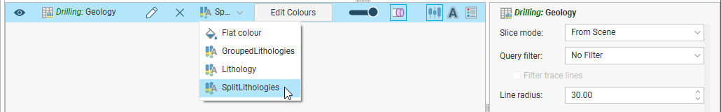 With the split lithologies tool, you can create new lithologies from lithologies in an existing lithology column by selecting from intervals displayed in the scene. When you split lithologies, the original lithology column is preserved and a new lithology column is added to the interval table.
